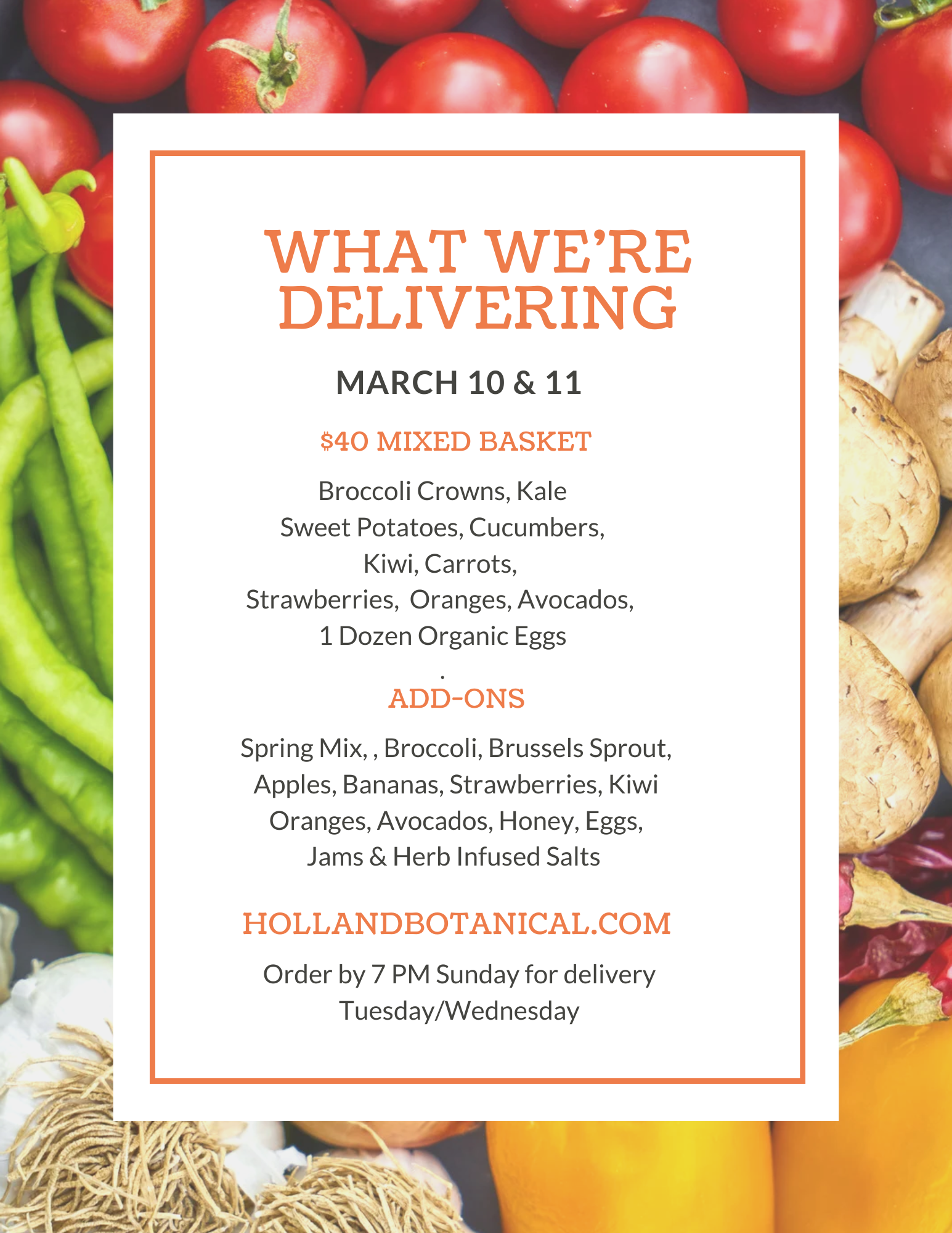 We are taking orders through 7 PM Sunday for our next delivery on