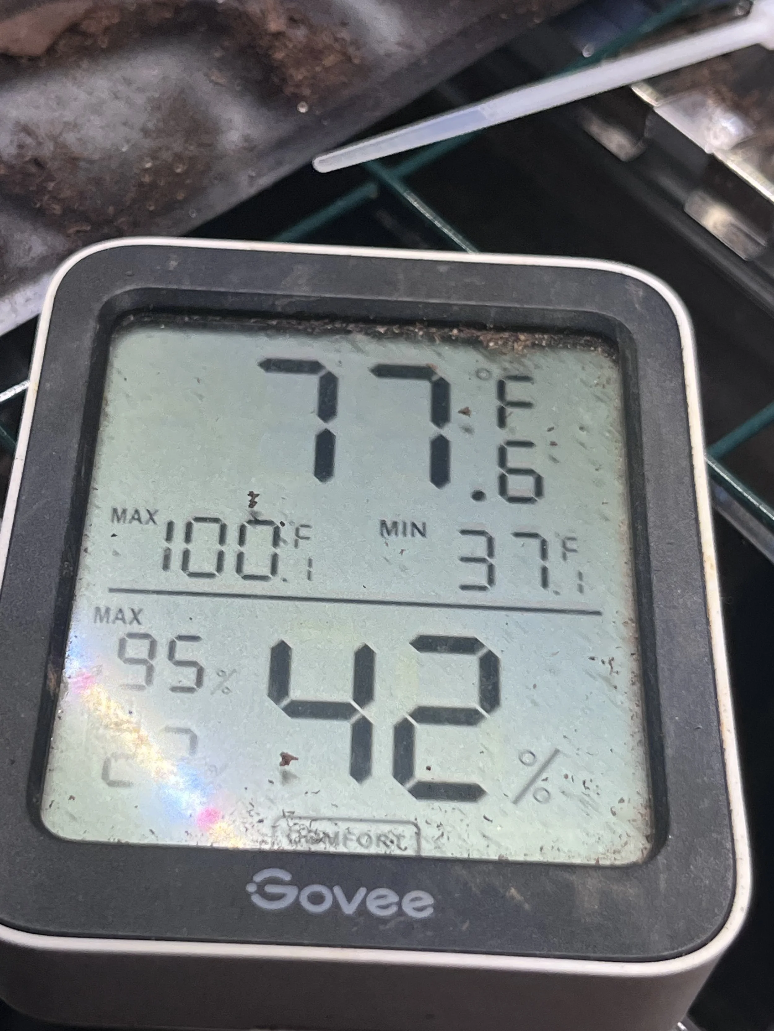 Between the heating mats, the grow lights, the location of the mini greenhouse in the room and the temperature of our house, 77 degrees is the sweet spot.