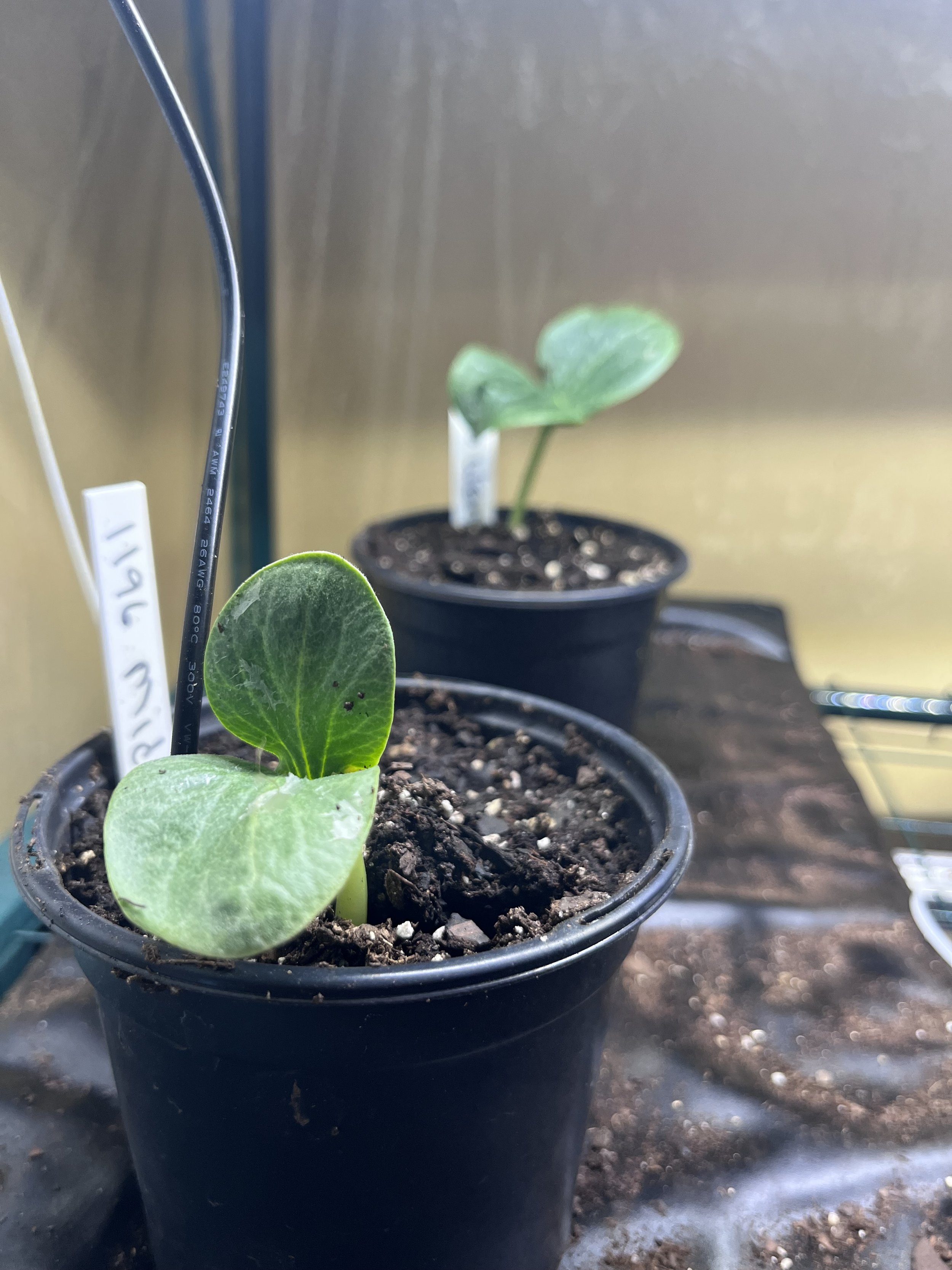 With the seeds tucked in to their 4 -inch pots filled with their fancy dirt, we watered and put them on the heating pads.